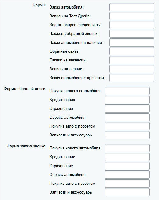 Получатели результатов форм заносятся в настройках Дилерского Центра, в блоке полей «Формы»,как указано на изображении: